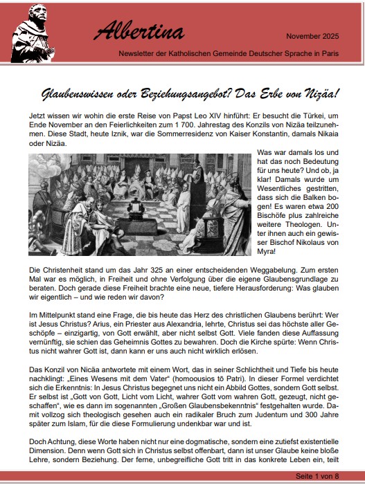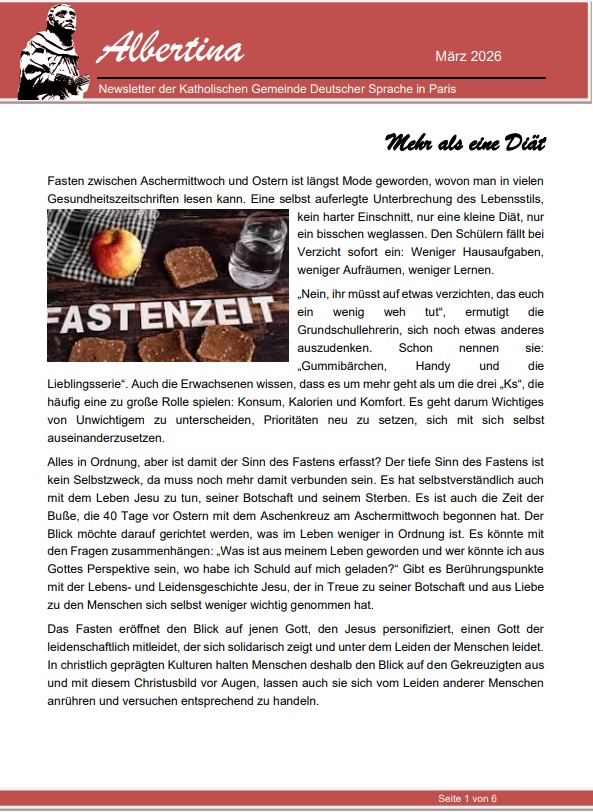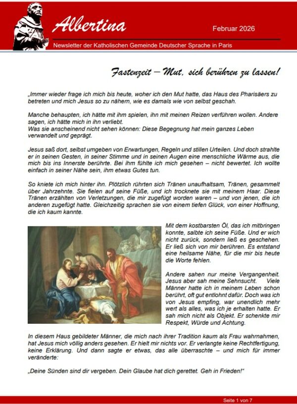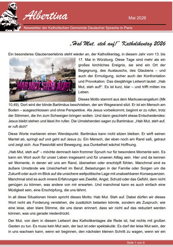 … ist unser elektronischer Monatsbrief, der einmal im Monat erscheint, Sie über aktuelle Termine informiert und auf besondere Veranstaltungen hinweist. Er wird per E-Mail an alle eingeschriebenen Adressen versandt. Wenn Sie unseren regelmäßigen Monatsbrief abonnieren möchten, senden Sie einfach Ihre E-Mail-Adresse an: info@kgparis.eu